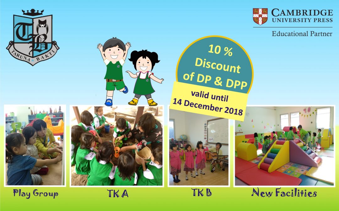 Register now & get 10% Discount for DP & DPP for registration until 14 December 2018 Aug 28, 2018 | Kegiatan Register now and get 10% DISCOUNT for DP & DPP. For registration until 14 December 2018. Play Group (3-4 year old) TK A (4-5 year old) TK B (5-6 year old)